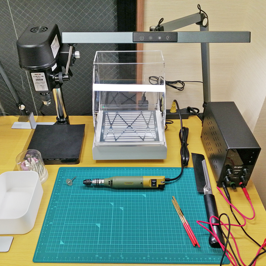 リューター(各種ビット有り)、集塵機、安定化電源、各種ダイヤモンドヤスリ、薄刃ノコギリ、タイヤセッター(イーグル模型改)等、本気の工具が揃っています。HOBBY FACTORYでガッツリ加工してください!