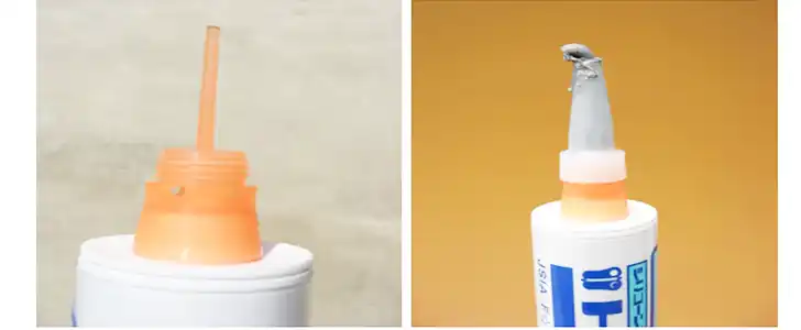 エルヨンキャップは残ったコーキング材の硬化を防ぎます。 ノズルに残ったコーキング材の硬化を促進し、カートリッジに残ったシール材を硬化しにくくします。 使用後のコーキングのキャップにエルヨンキャップをつけ、さらに使いかけのコーキング材のキャップを重ねます。 2日後にはコーキング材のキャップ内のコーキングがキレイにとれます。 そのあと通常どおり、すぐにそのまま続けてご使用になれます。