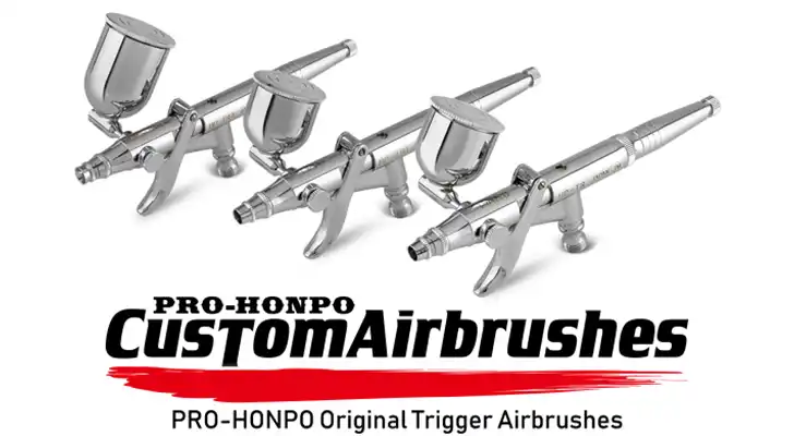 プロホンポ カスタムエアブラシシリーズ アネスト岩田のレボリューションシリーズ をベースにプロホンポ がエアブラシビギナーからエキスパートまで使いやすいようオリジナルのプリセットハンドルをつけました。 トリガーを引くだけの簡単操作 トリガーアクションタイプはトリガーを引き続けると塗料が出る仕組みになっています。 トリガーを引く量と塗料の吐出量は比例していますのでグラデーションも容易です。 口径0.5mm 口径は0.5mmなので比較的顔料の大きな水性塗料やメタリック(模型用塗料)でも詰まりにくいです。 比較的大きな面積の塗装でもパターン幅が広くムラになりにくいです。 サフェーサーなどの下地塗装や仕上げのクリヤー塗装などに最適です。 ご使用の塗料がエアブラシ使用中に良く詰まる場合はさらにワンサイズ大きな口径のエアブラシをお勧めします。
