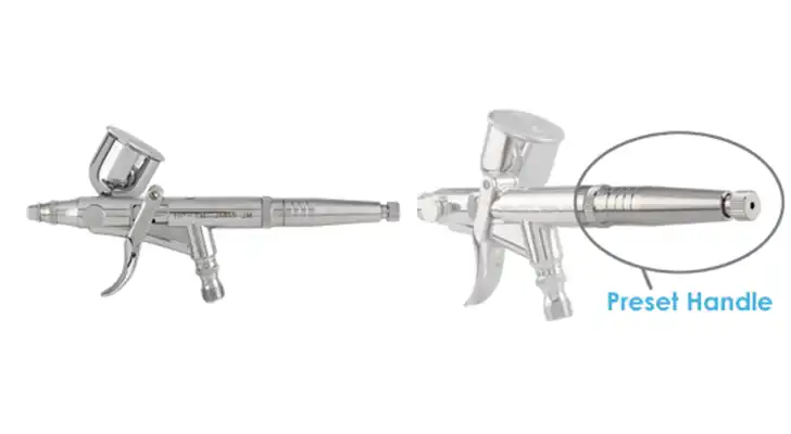 プロホンポ カスタムエアブラシ アネスト岩田TR2 は口径0.5mmのトリガーアクションタイプのエアーブラシです。 アネスト岩田レボリューションシリーズ エアブラシ HP-TR2 をベースにプロホンポオリジナルのプリセットハンドルをつけました。 塗料噴出量の調節が可能な「プリセットハンドル」を標準装備していますので、エアブラシビギナーでも塗料を出しすぎる失敗がありません。 トリガーアクションタイプのエアーブラシは操作が容易で、トリガーを引くだけでエアーが出ます。 さらにトリガーを引き続けると塗料が出る仕組みになっています。 トリガーを引く量と塗料の吐出量は比例していますのでグラデーションも容易です。 作業中の操作はトリガーを引くだけなので、長時間の作業でも疲れにくく、連続して作業ができます。 これからエアーブラシを始める方はもちろん、長時間作業を可能にするので、エアーブラシのエキスパートにもお勧めします。