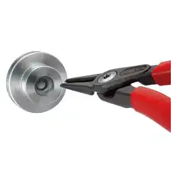 簡単に穴用スナップリングの取り付け、取り外しができます。 先端チップは強靭な特殊バネ鋼製です。 長時間使用における高負荷に耐え、ツール寿命は一般的なスナップリングプライヤーの10倍以上です。 スクリュージョイントを採用しており、大変滑らかに可動します。 鍛造により大変頑丈です。 先端チップはリングとの接触面積が広いため、リングを歪めず確実に保持することができます。 スリムなヘッド形状により、狭い場所での作業も可能です。 高硬度ばね鋼製の先端部はポジティブ結合によって取り付け、圧着されているので、固くはまり込んだスナップリングを取り外す場合など、過度な負荷でも非常に安定しています。 広い接触面と先端部のポジションにより、リングが飛び出し難くなっています。 先端部には、刻み目のない高硬度ばね鋼製が使用されています。 先端部は動的にも静的にも高い負荷に耐えます。 開き制限ガードが付いているので、規格に合うだけでなく耐久性にも優れています。