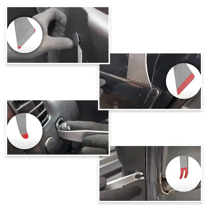 CUSTOR TrimClipRemovalToolSet トリムリムーバーツールセットは金属素材なので、破損しにくく丈夫です。 プラスチック製のパネル外しツールと異なり、しなることがなく、加えた力をダイレクトに伝えることができます。 ダッシュボードやトリムモール、ガスケット、内張クリップ等、外装、内装品の取り外しで使える工具です。 また、自動車やバイクだけでなく、家電やスマホなどのハメ込み式のプラスティック部品の取外しにも活用できます。 先端の厚さは約0.5mmなのでわずかなすき間でも差し込むことができます。
