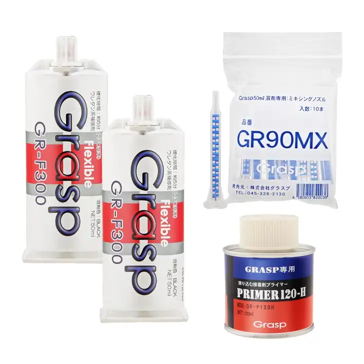 Grasp グラスプ 高性能ウレタン系 補修用弾性接着剤 GR-F300 は2液混合型の補修用弾性接着剤です。 硬化後も柔軟性を持ち、高い接着強度も兼ね備えた新しいタイプの接着剤です。 柔軟性を持ちながら、切削性も向上していますので、仕上げがより楽になります。 使用用途としては、薄く成形された樹脂パーツやバンパーのアール部分、細かな部位の接着に適しています。 難接着のPP樹脂や再生樹脂等に使用するプライマーと専用ミキシングノズル10本をセットにしました。