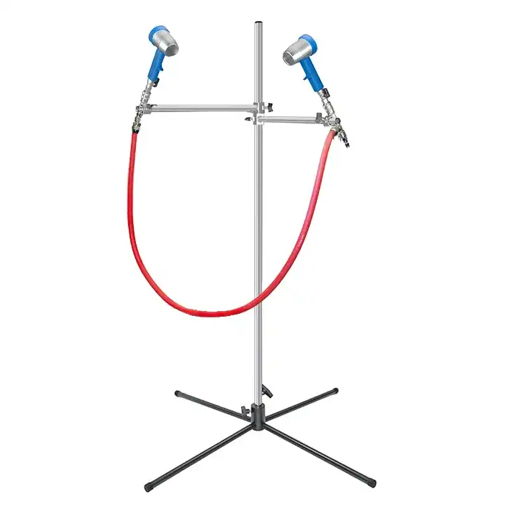 スタンドは、強さと軽さをかねそなえたアルミニウムの高さ調節可能なポールでできています。そして装備された可動式エアマニホールドが、ガン搭載ポジションのほとんど無限の多様さを実現します。